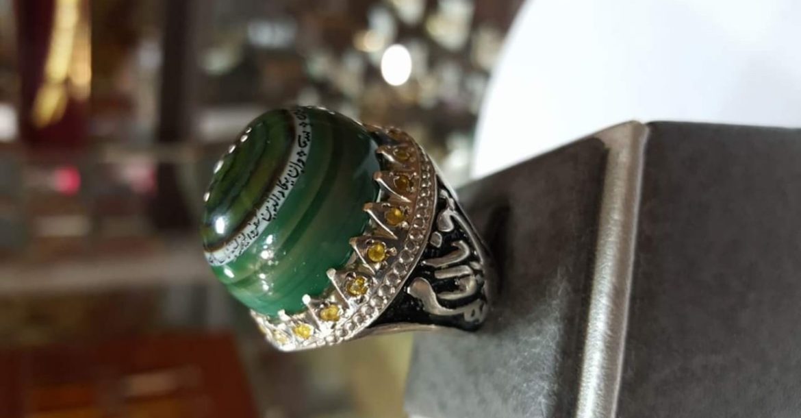 خاتم عقيق سليماني صياغة مشهد وزن 31.8 مرصع ياقوت اصفر منقوش على الفضة ثامن اﻻئمة الامام الرؤوف منقوش على الحجر (وَإِنْ يَكَادُ الَّذِينَ كَفَرُوا لَيُزْلِقُونَكَ بِأَبْصَارِهِمْ لَمَّا سَمِعُوا الذِّكْرَ وَيَقُولُونَ إِنَّهُ لَمَجْنُونٌ وَمَا هُوَ إِلَّا ذِكْرٌ لِلْعَالَمِينَ) للطلب الخاص