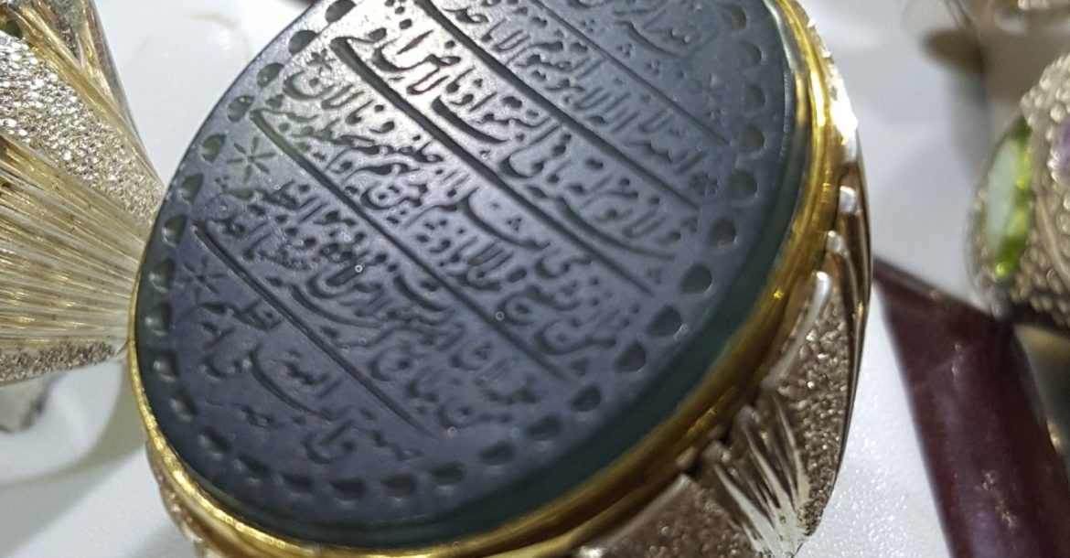خاتم مع روديوم متوج ب عقيق يمني اخضر النقش: آية الكرسي |للطلب الخاص|0096181323265